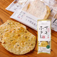 秋田の淡雪の結晶をモチーフにした六角形の秋田県産うるち米の薄生地を、高温の油でさっと手揚げ。淡雪のようなふわりとした見た目とサクサク食感がクセになる揚げ煎餅。