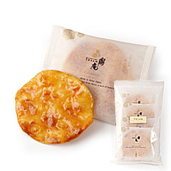 秋田の淡雪の結晶をモチーフにした六角形の秋田県産うるち米の薄生地を、高温の油でさっと手揚げ。淡雪のようなふわりとした見た目とサクサク食感がクセになる揚げ煎餅。