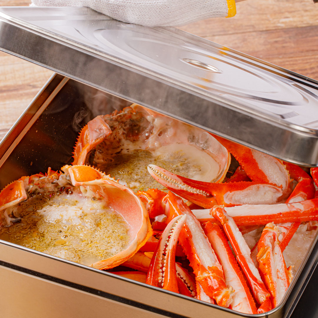 紅ズワイガニといえばボイル済み(調理済み)が定番ですが、この「蟹缶」ならフタの真ん中の穴から湧き上がる湯気を見ながら、完成を待つ調理時間のワクワク感も味わうことができます。パーティやBBQなどの際にぜひお楽しみください。