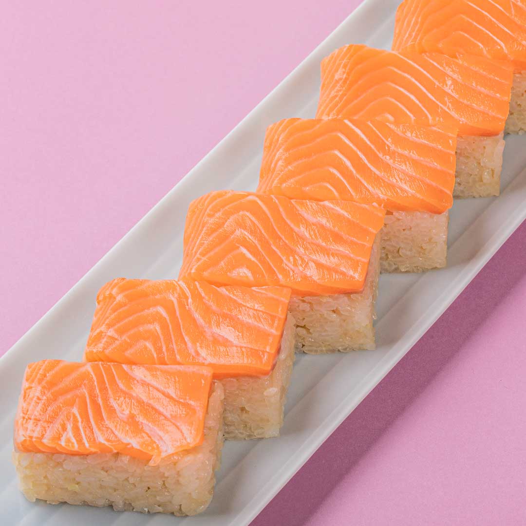 養殖事業はまだまだ試行錯誤段階のため、小規模でほとんどが手作業のため、飼育コストが高く、お手頃な価格のサーモンとは言えない状況ですが、男鹿の新たな特産品のPRの一環として、こちらも押し寿司にしました。