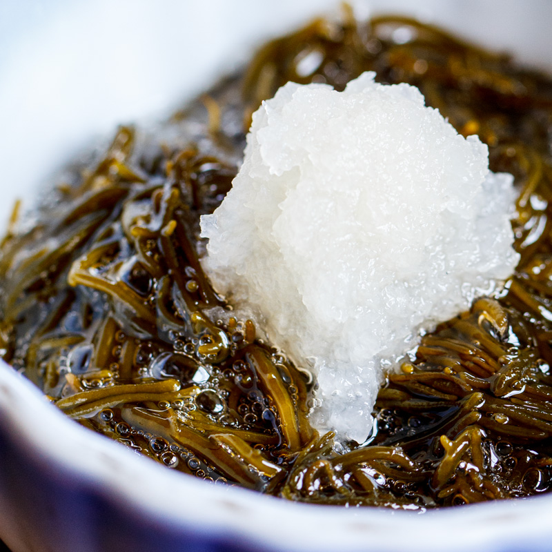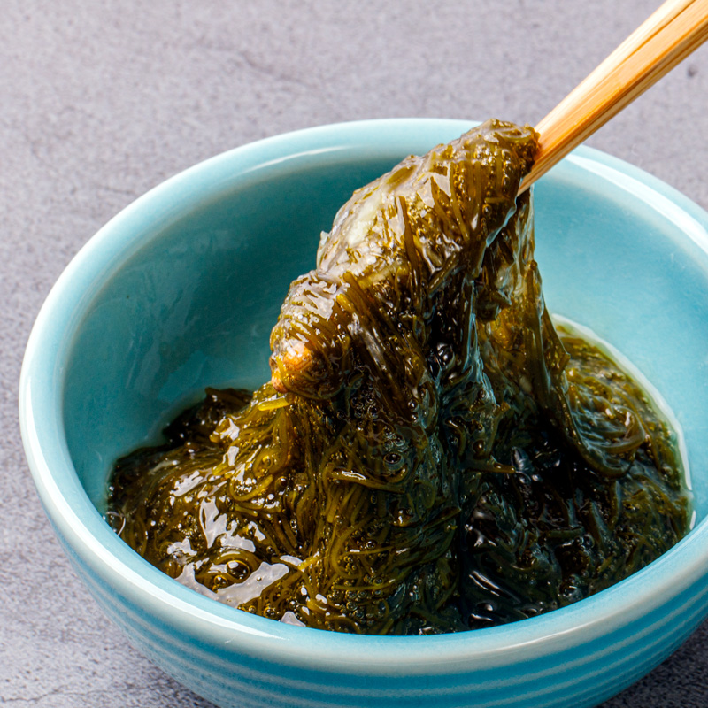 モズクのような紐状の海藻で、海中ではその名の通り黒褐色をしており、ボイルすることで緑を帯びた褐色にかわります。