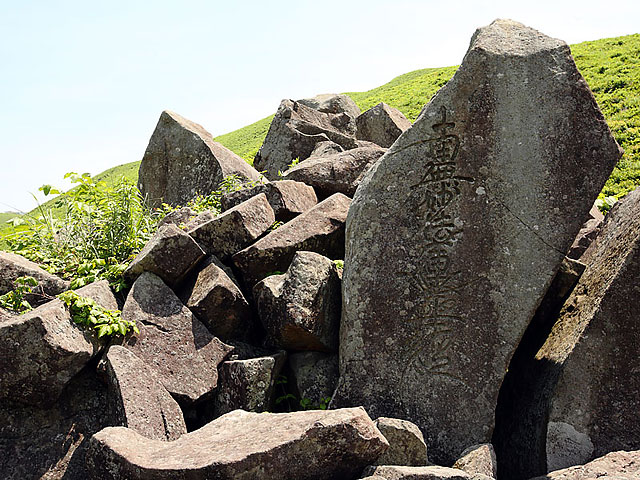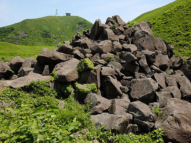 寒風山の頂上の下、妻恋峠から北に下りヘアピンカーブを2回曲がると、お盆のような景色が広がります。ここがかつての大噴火口で、この一角に、大きな石がうず高く積み重なっています。