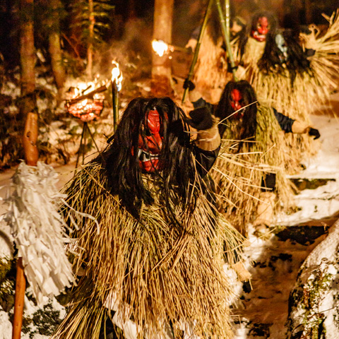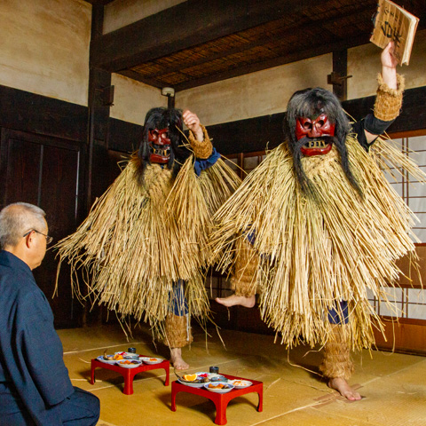 僧侶們將烤好的芝麻餅(年糕)供奉給生剝鬼,之後生剝鬼們返回深山中的神靈身邊。祭典以「里之生剝鬼」表演落下帷幕,來自男鹿各地的生剝鬼們身著各式面具和服飾登場,讓您親身感受生剝鬼豐富多彩的獨特魅力。
